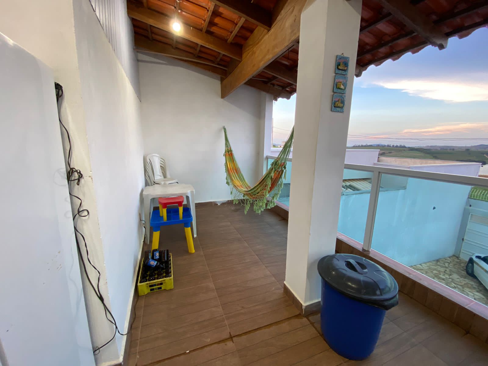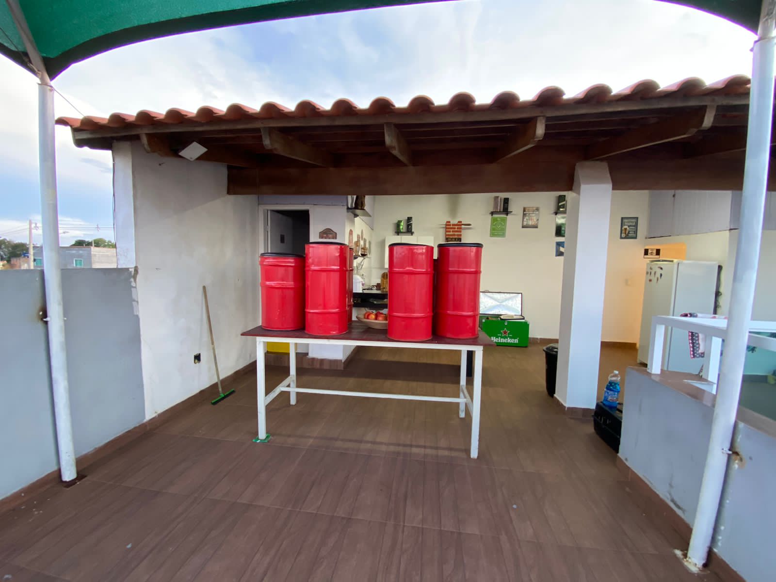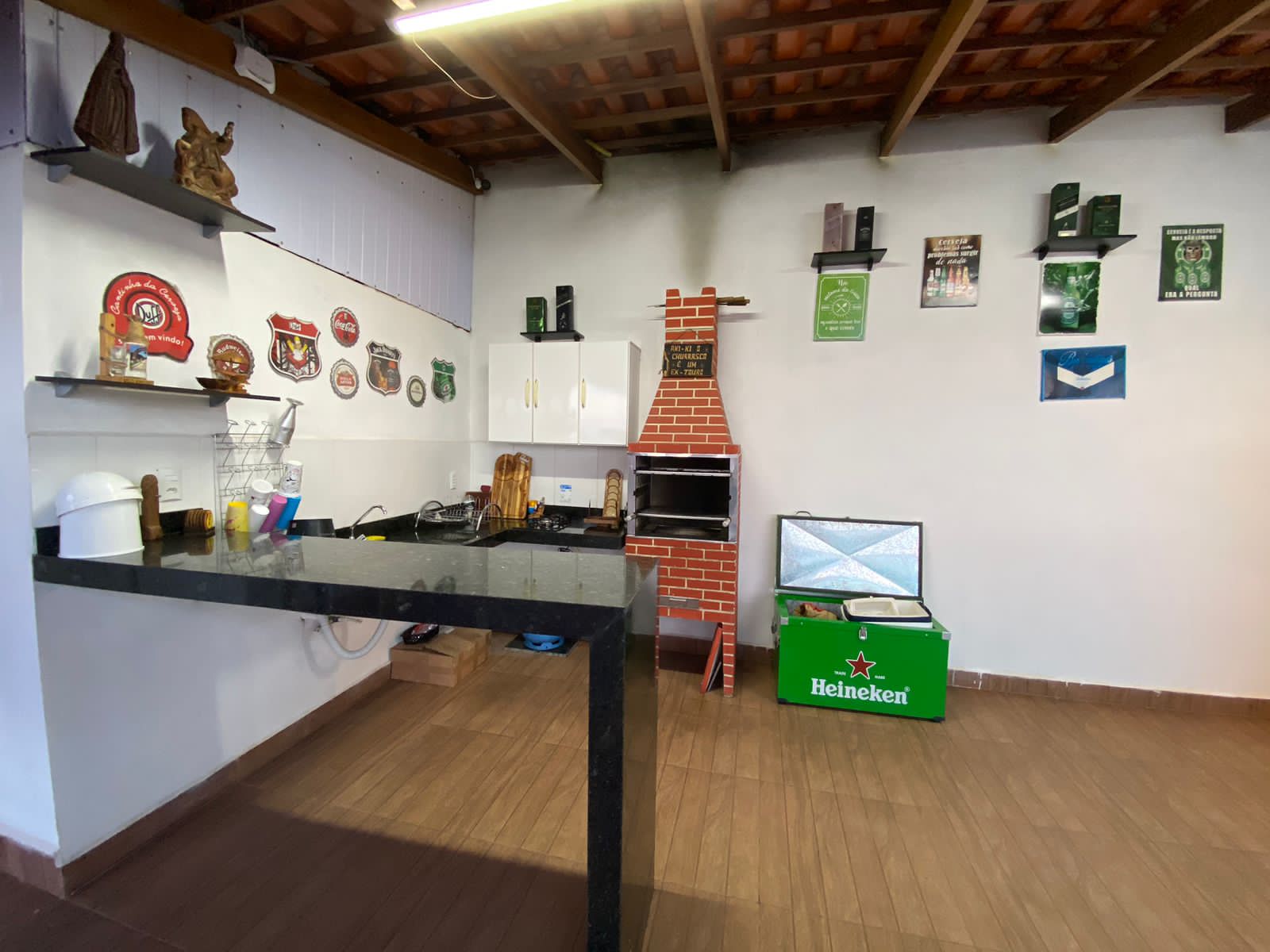 Piscina com LED e prainha, Chuveirão, Geladeira, Caixa Térmica de 120 Litros, Fogão Cooktop 2 bocas, Churrasqueira,1 Banheiro, 3 mesas e 13 cadeiras de plástico, 1 mesa, 1 banco de madeira 3 lugares e 6 cadeiras de tambores, WIFI.